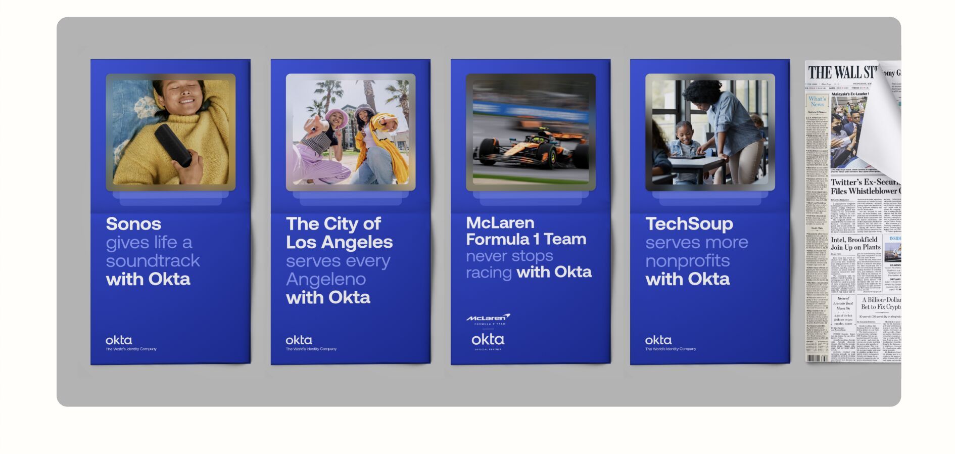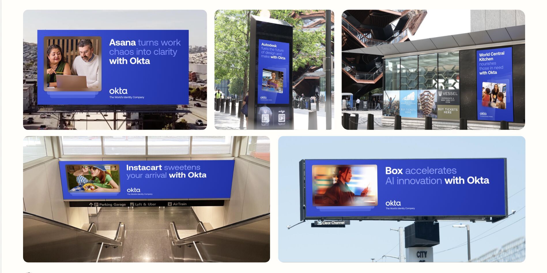 Okta has been running this playbook at serious scale. Their customer campaign has stretched from SFO to JFK — bus shelters, airport displays, billboards along the 101, even a spread in the Wall Street Journal. Brands like Qualified, McLaren Formula 1, The City of Los Angeles, and Instacart aren't just mentioned in the creative. They are the creative.