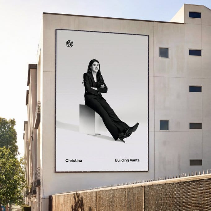 Not a case study PDF. Not a testimonial tucked at the bottom of a landing page. An actual, giant billboard featuring Christina, founder of Vanta, with the simple caption: "Building Vanta." The OpenAI logo in the corner. No other explanation needed.
